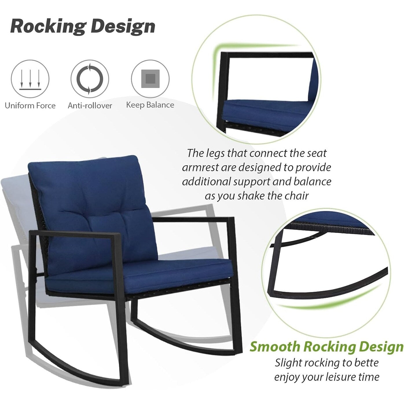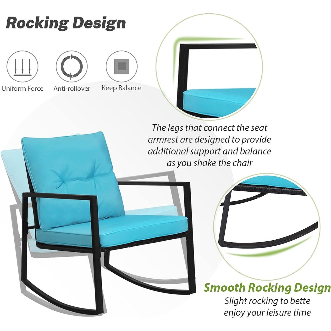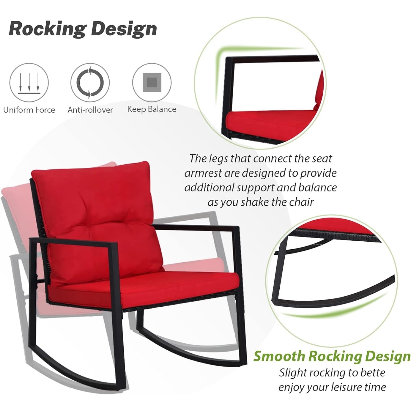 Rilassati con stile con il set da bistrot a dondolo in vimini da esterno SUNCROWN da 3 pezzi. Questo set resistente include due sedie a dondolo imbottite e un tavolino quadrato, tutti realizzati con struttura in ferro e vimini intrecciato in PE. Le sedie sono dotate di cuscini in tessuto di poliestere con imbottitura in spugna in vari colori e fodere con cerniera. Con un design contemporaneo e una finitura nera, questo set si adatta a qualsiasi arredamento.