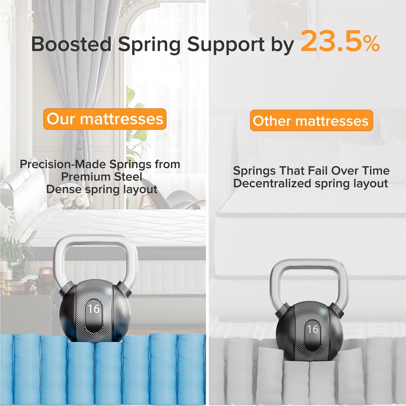 - Molle elicoidali più spesse del 23,5% rispetto allo standard di mercato : offrono un supporto migliore, una maggiore durata e impediscono il collasso.