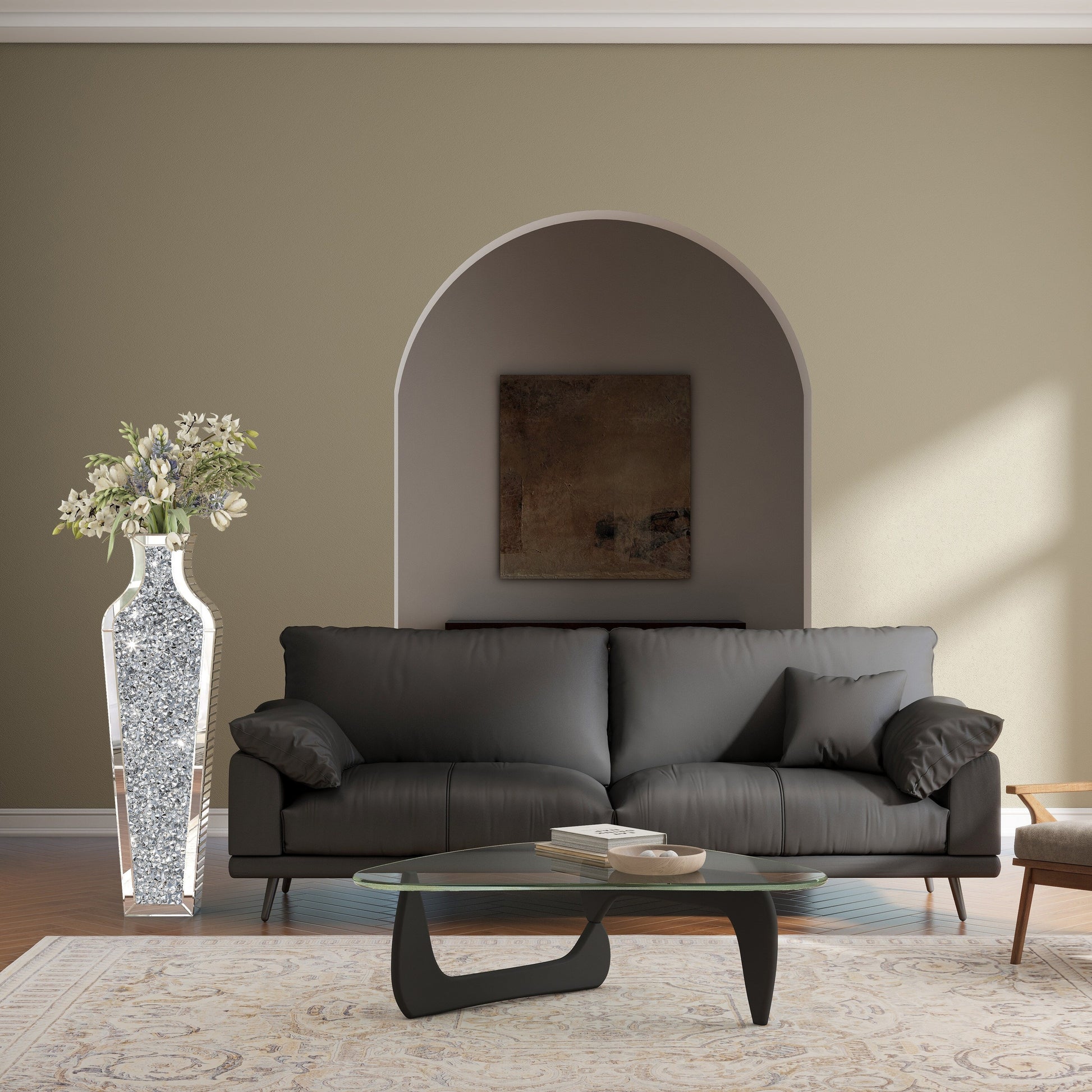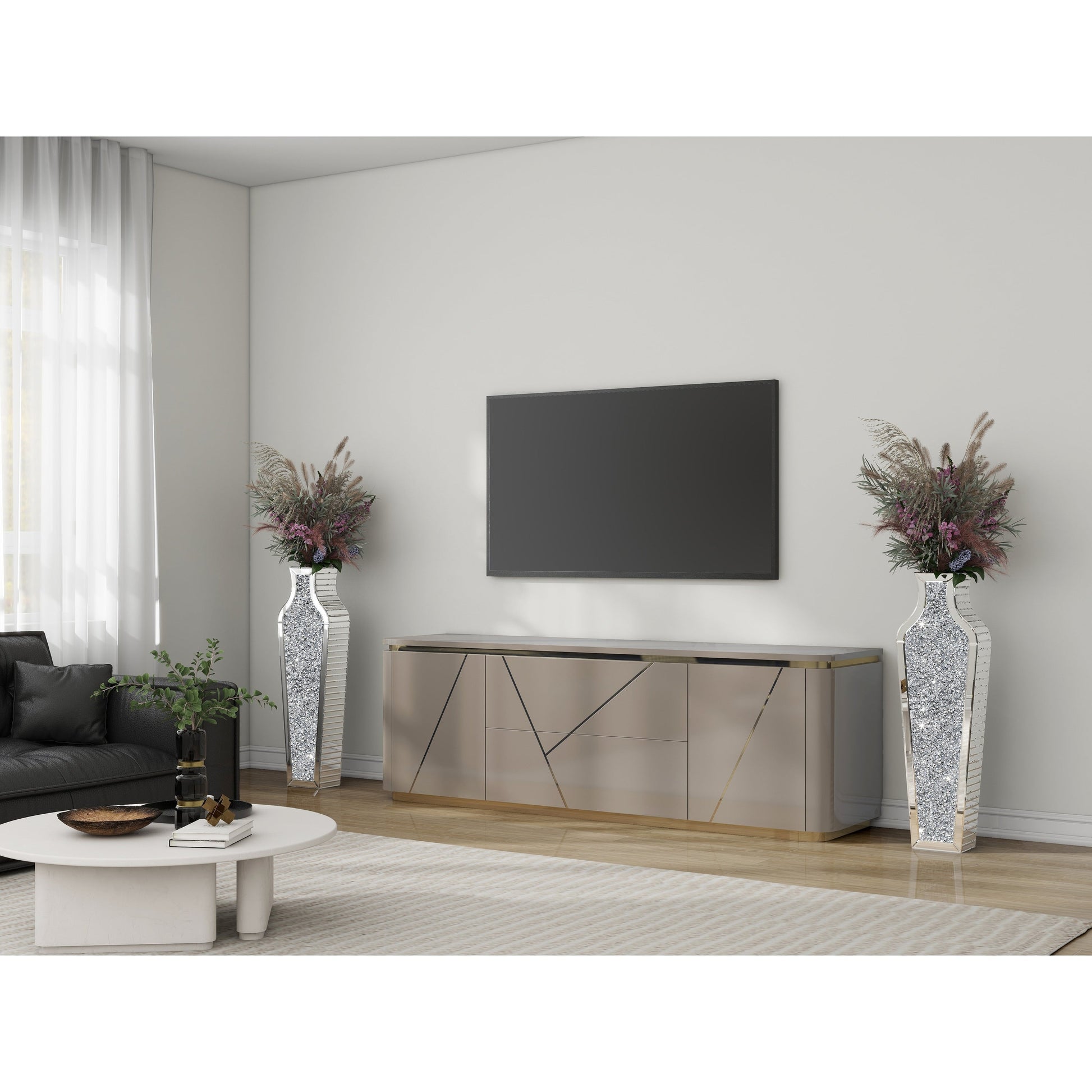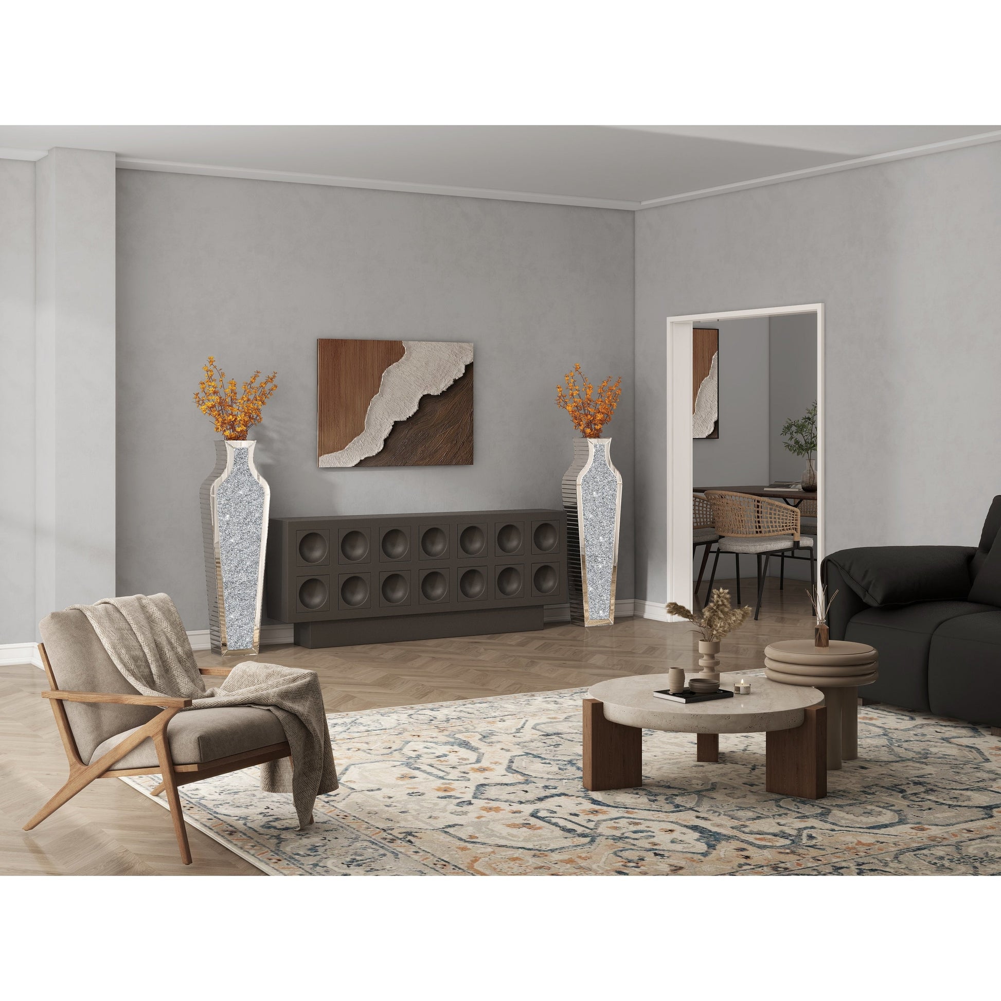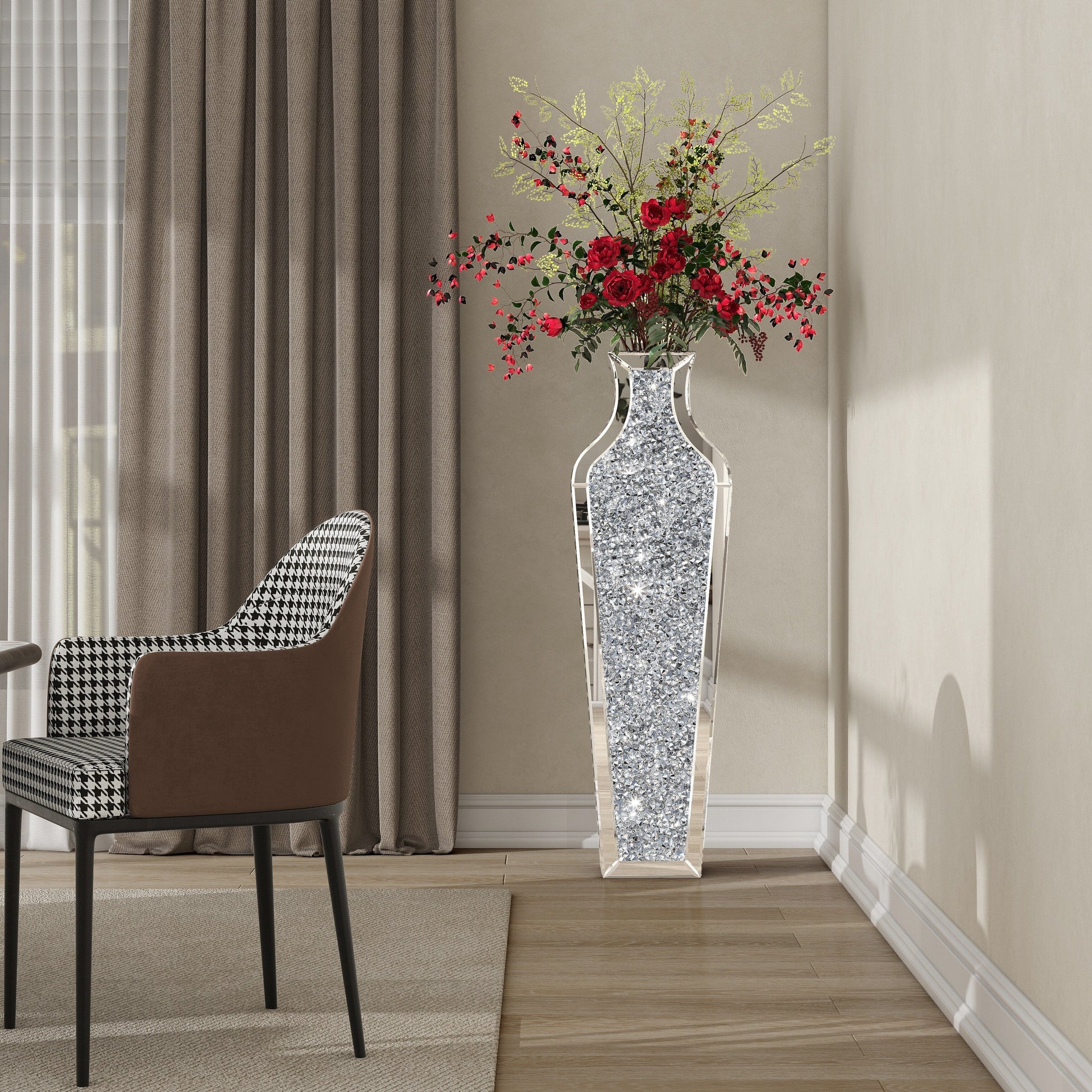 Se ami decorare la tua casa, questo vaso da terra sarà la scelta migliore. Può essere posizionato in qualsiasi angolo, soprattutto all'ingresso, accanto al mobile TV, al centro del divano. Apprezza il suo design al meglio su sfondi a tinta unita in ambienti eleganti. Crea un'atmosfera unica su una mensola del camino, una consolle o in qualsiasi spazio abitativo. Progettato con piano a specchio e corpo del vaso in diamante frantumato. Questo vaso da terra decorativo con motivi botanici e floreali aggiungerà luminosità e consistenza al tuo spazio abitativo. Adatto per uso interno. Stile glamour. Il vaso ha un'apertura di 11,6 cm, un vaso a specchio argentato da 71,4 cm/91,4 cm/110 cm.