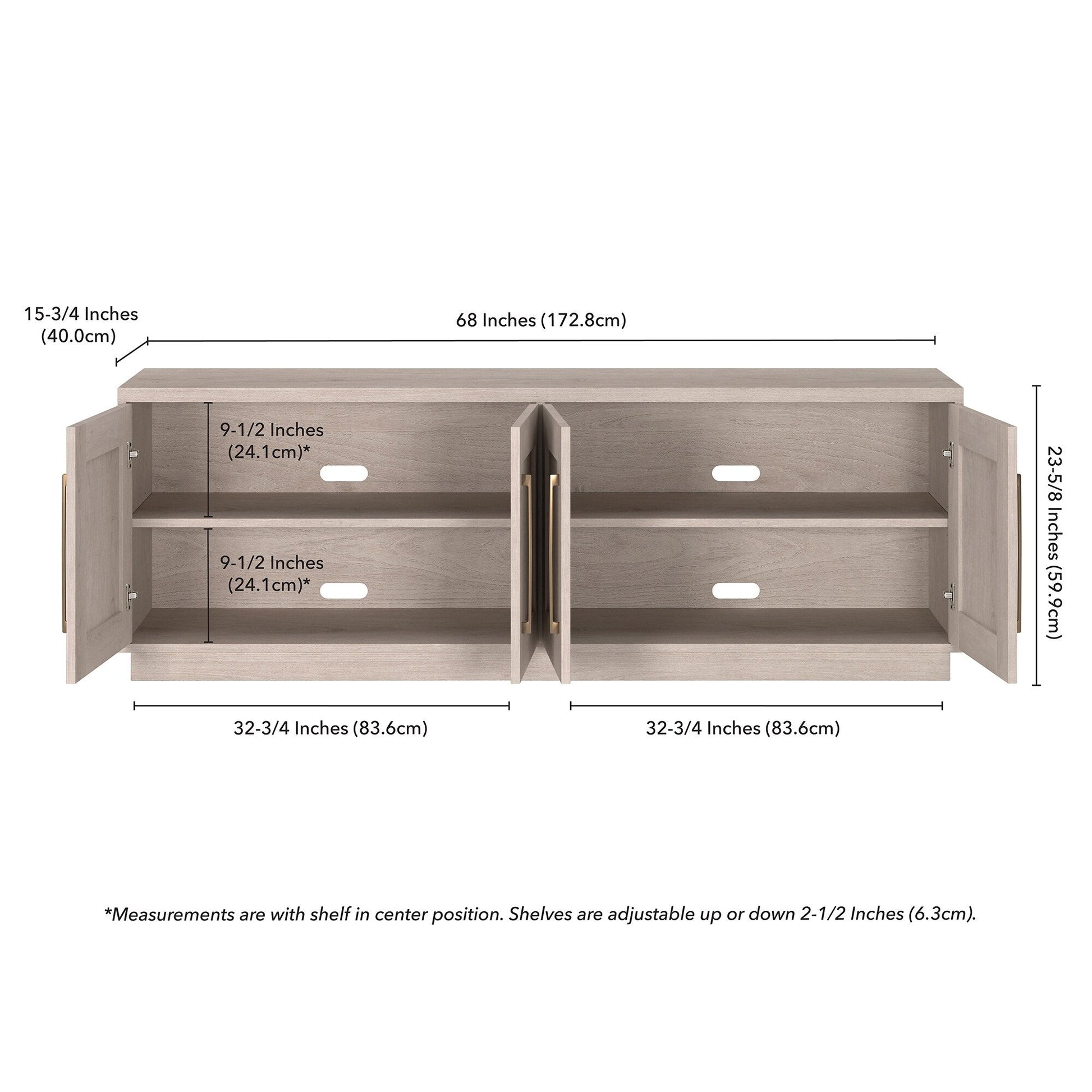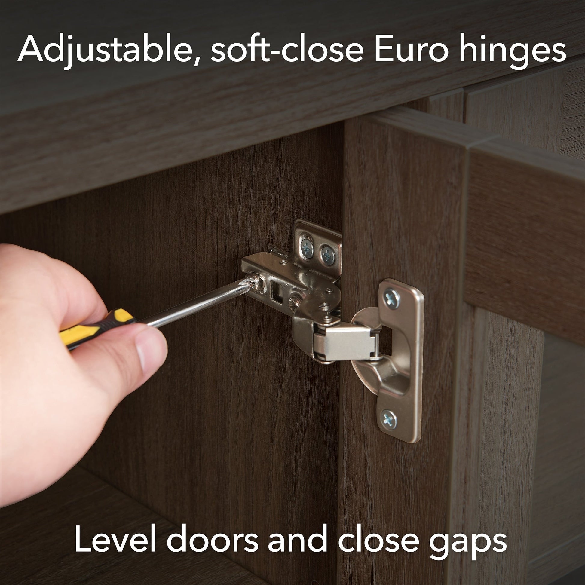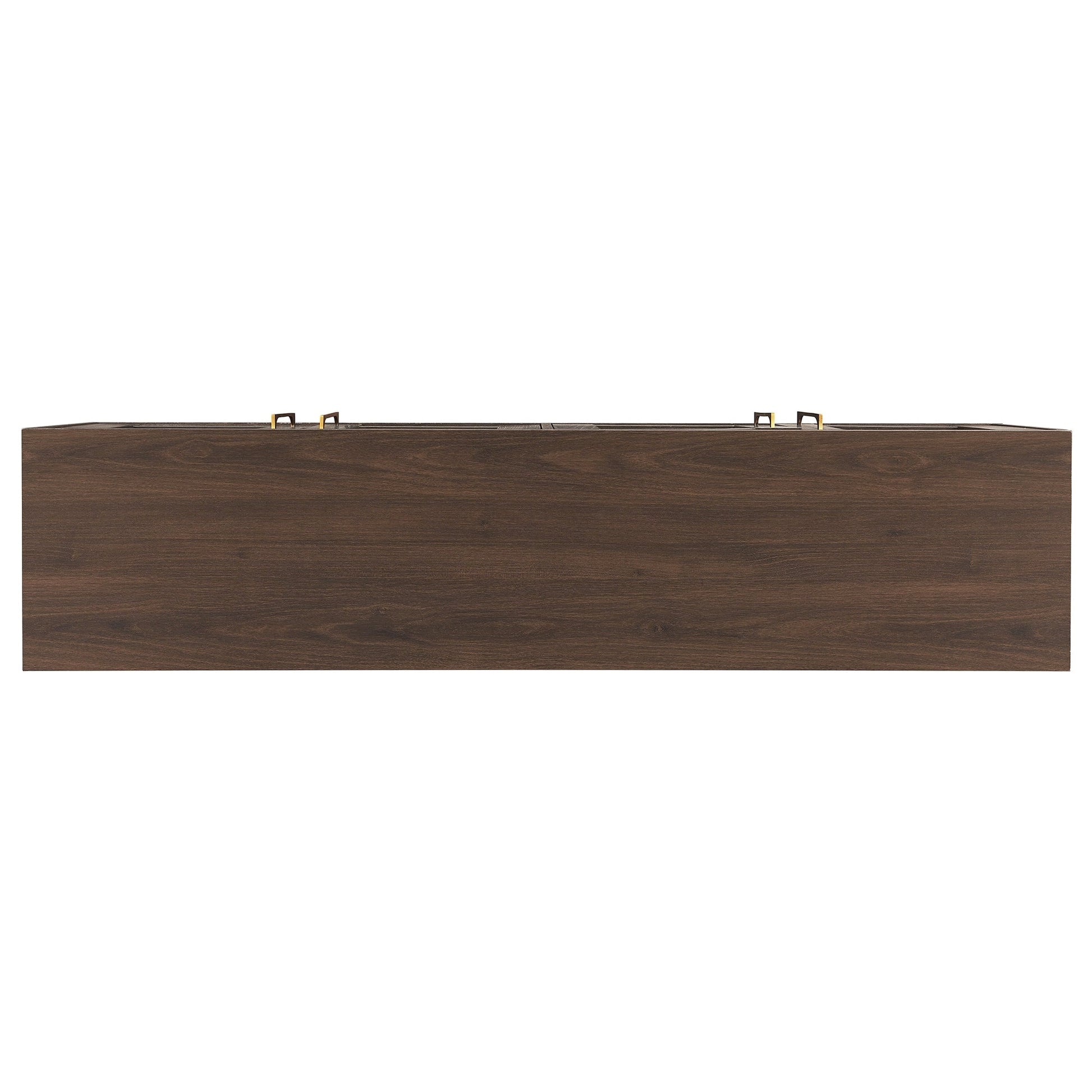 Combina funzionalità e design classico di transizione con questo moderno mobile TV. La sua ricca tonalità legno crea una calda palette neutra che si integra perfettamente con qualsiasi schema cromatico, mentre il suo stile classico si abbina perfettamente allo stile di design del tuo soggiorno, studio o sala giochi. Questo mobile con schienale robusto è dotato di due ampi mobili chiusi con eleganti ferramenta in ottone. I fori per la gestione dei cavi e i ripiani interni regolabili aiutano a mantenere in ordine i tuoi dispositivi multimediali e le tue console.