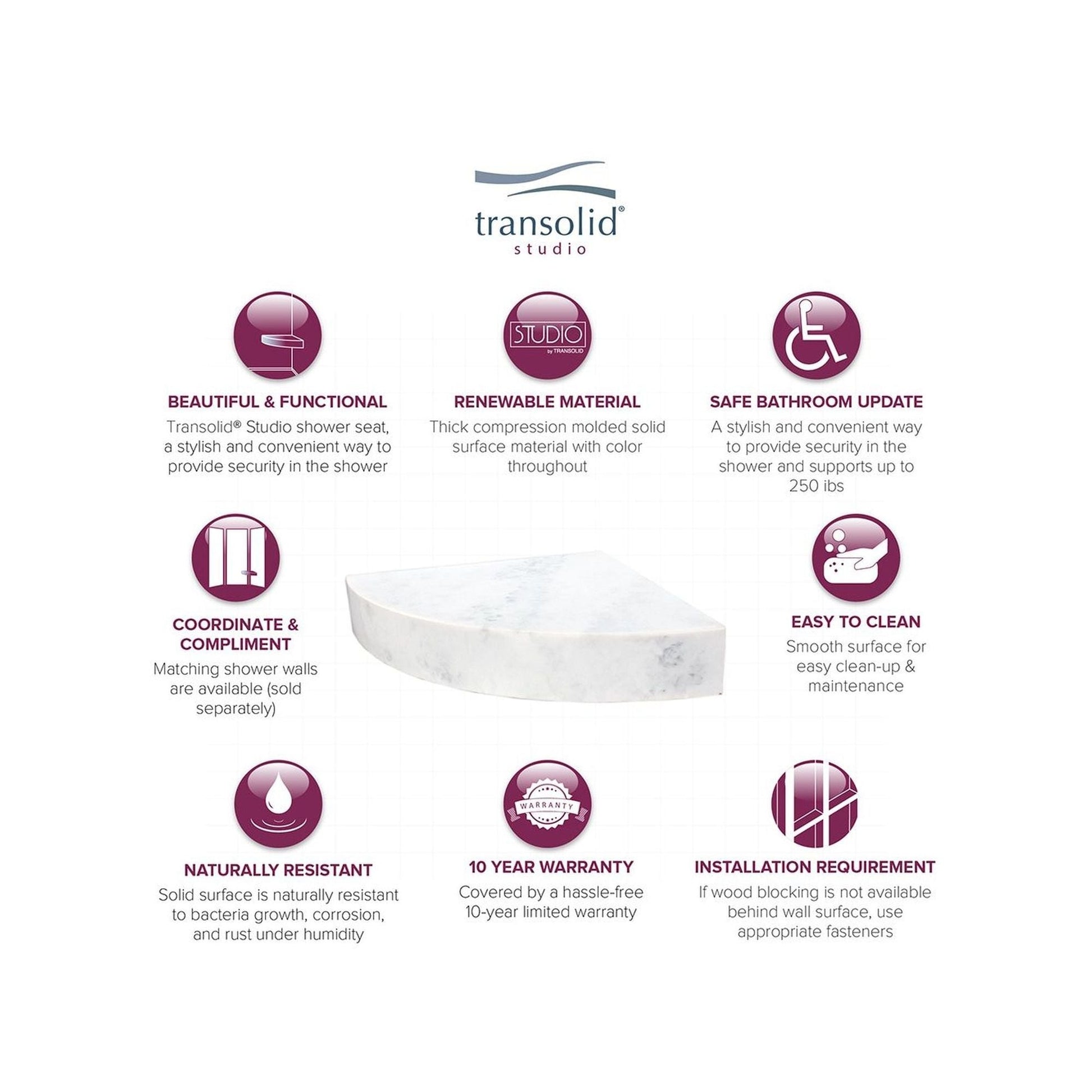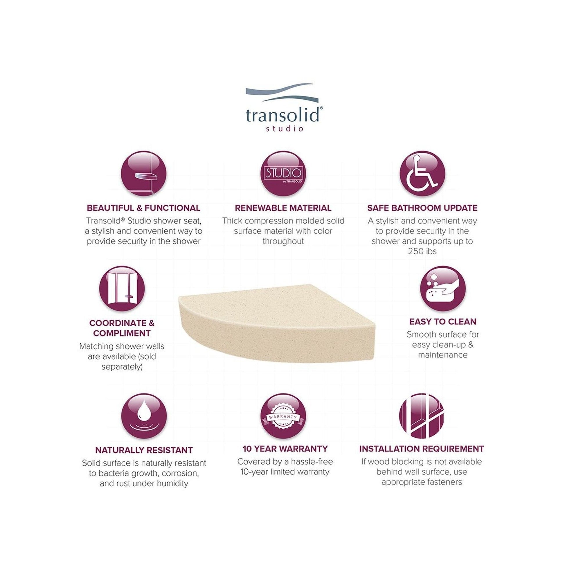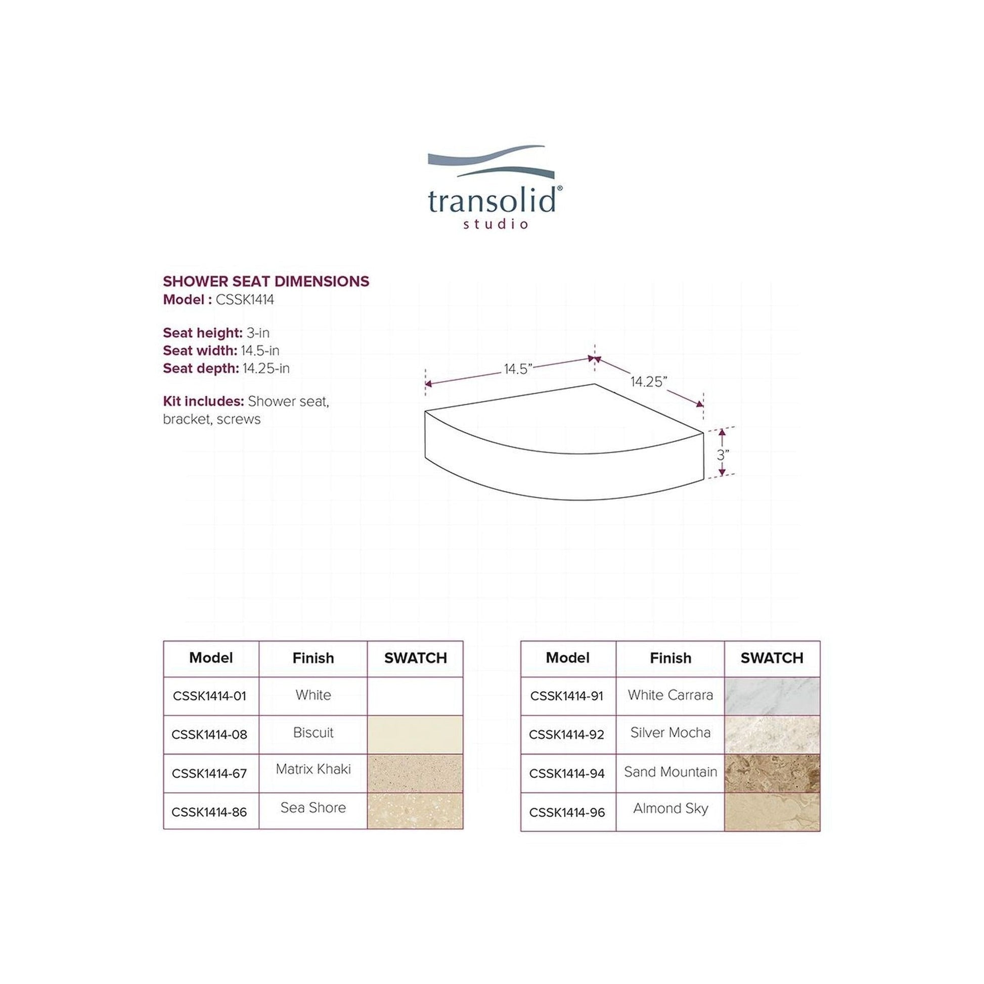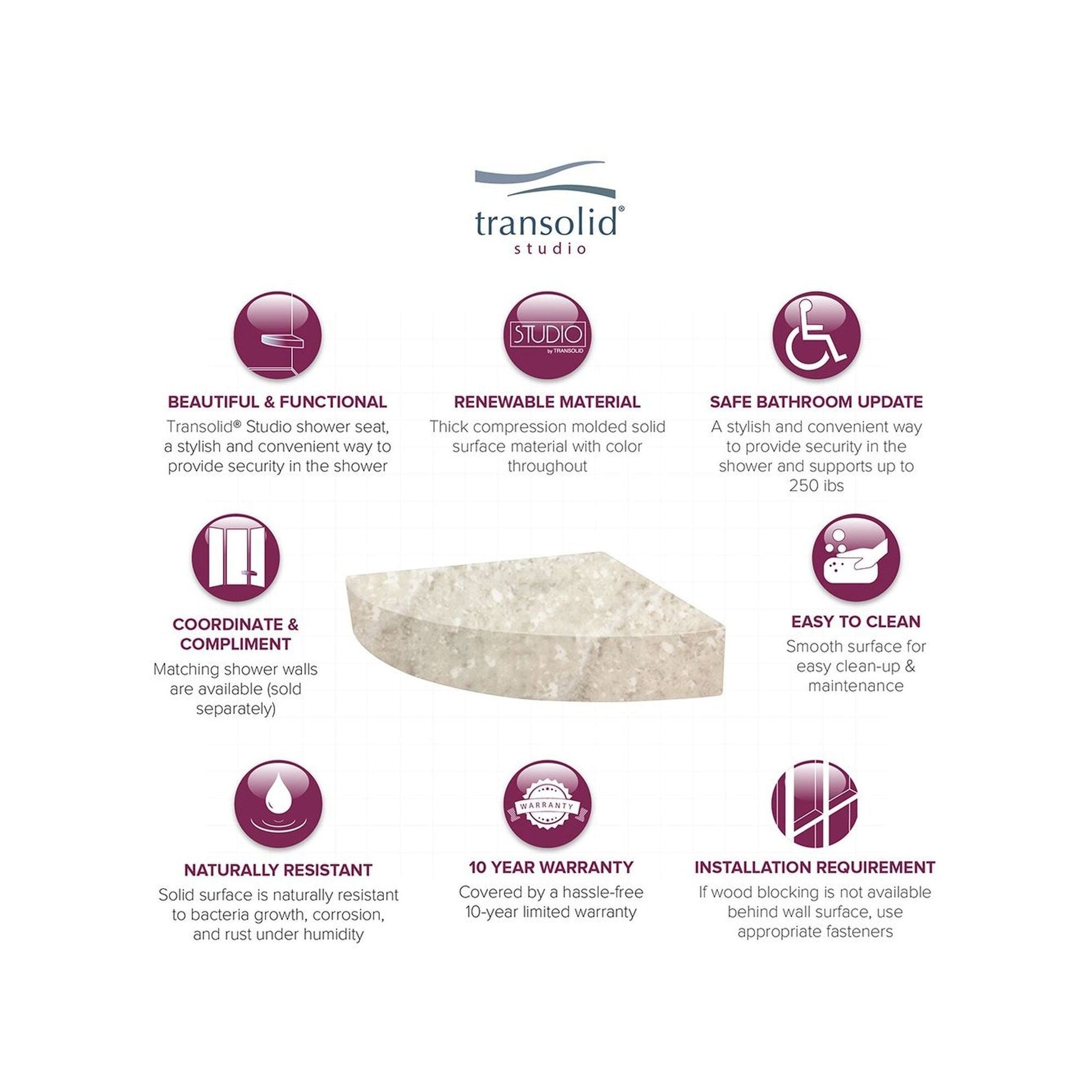 Sedile angolare per doccia Transolid Studio da 14 pollici x 14 pollici in superficie solida, montaggio a parete - 14,5 x 14,25 x 3