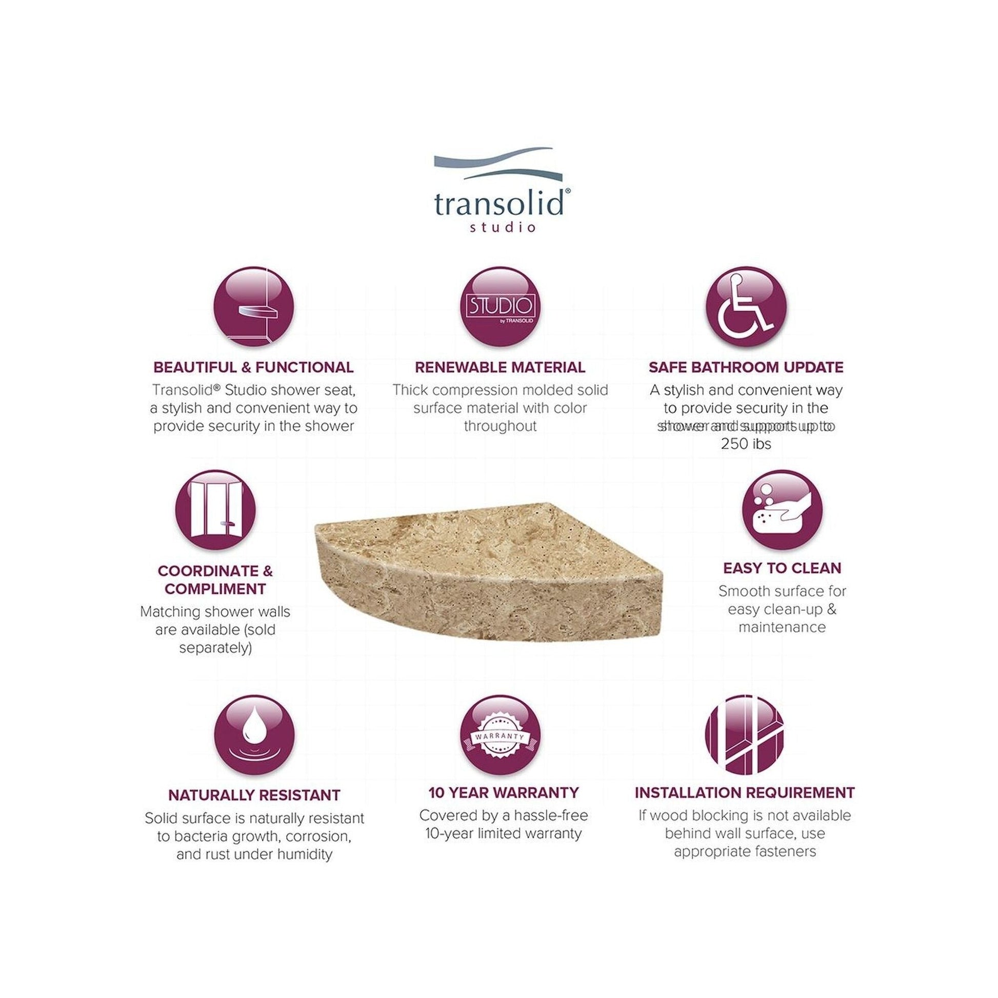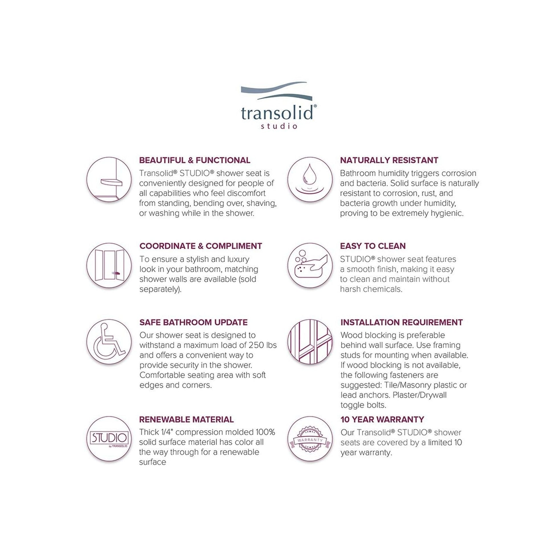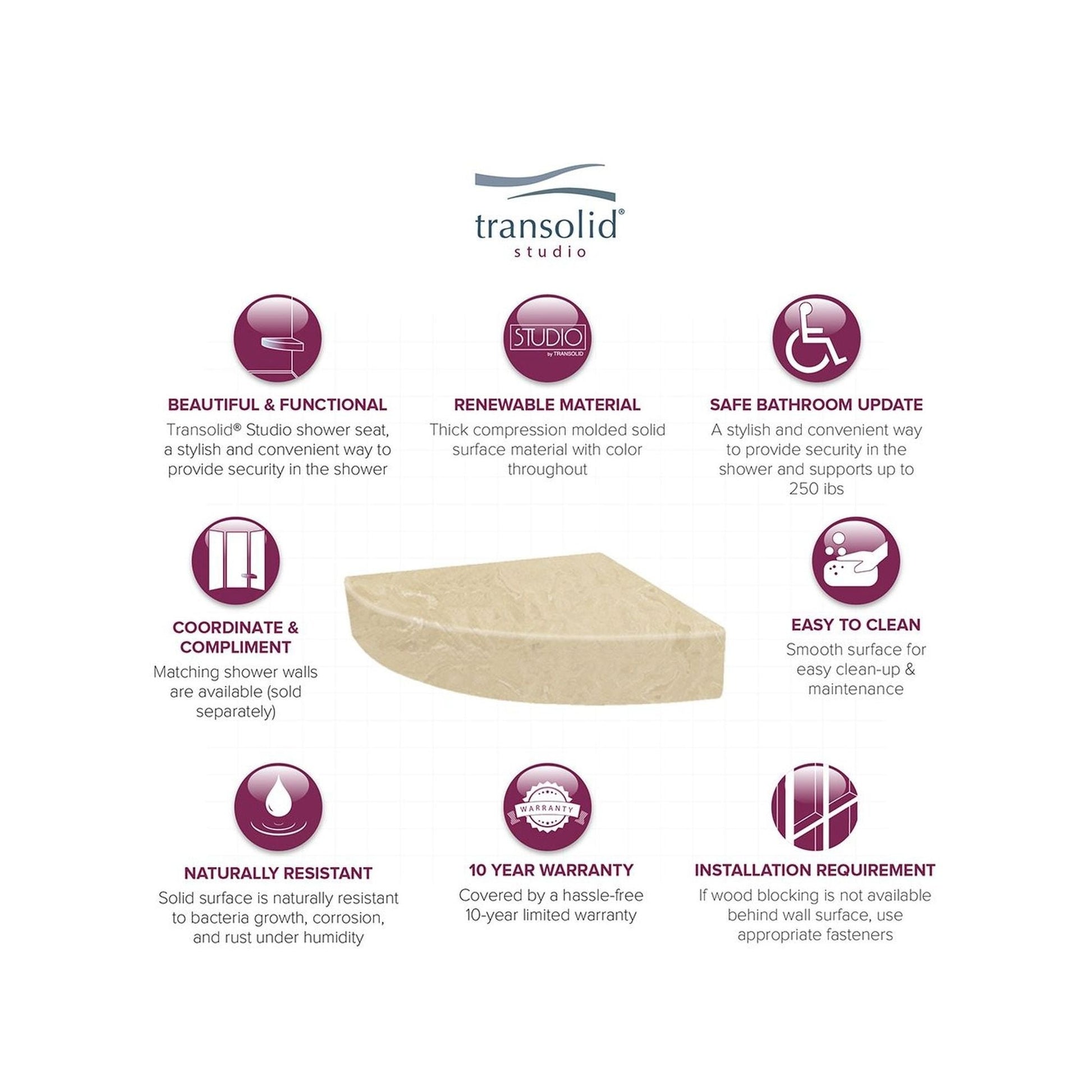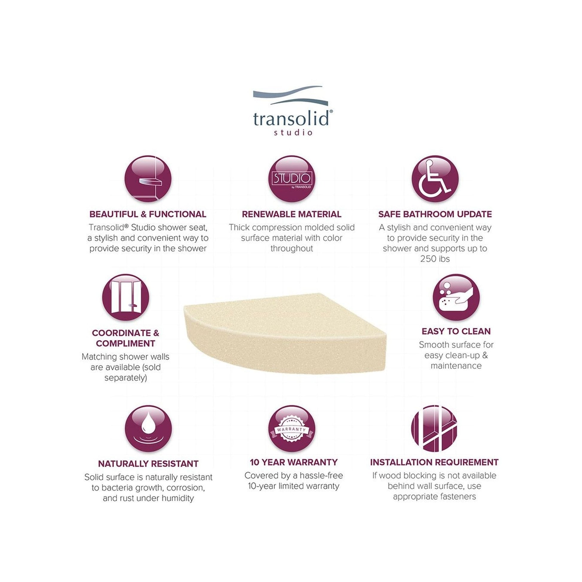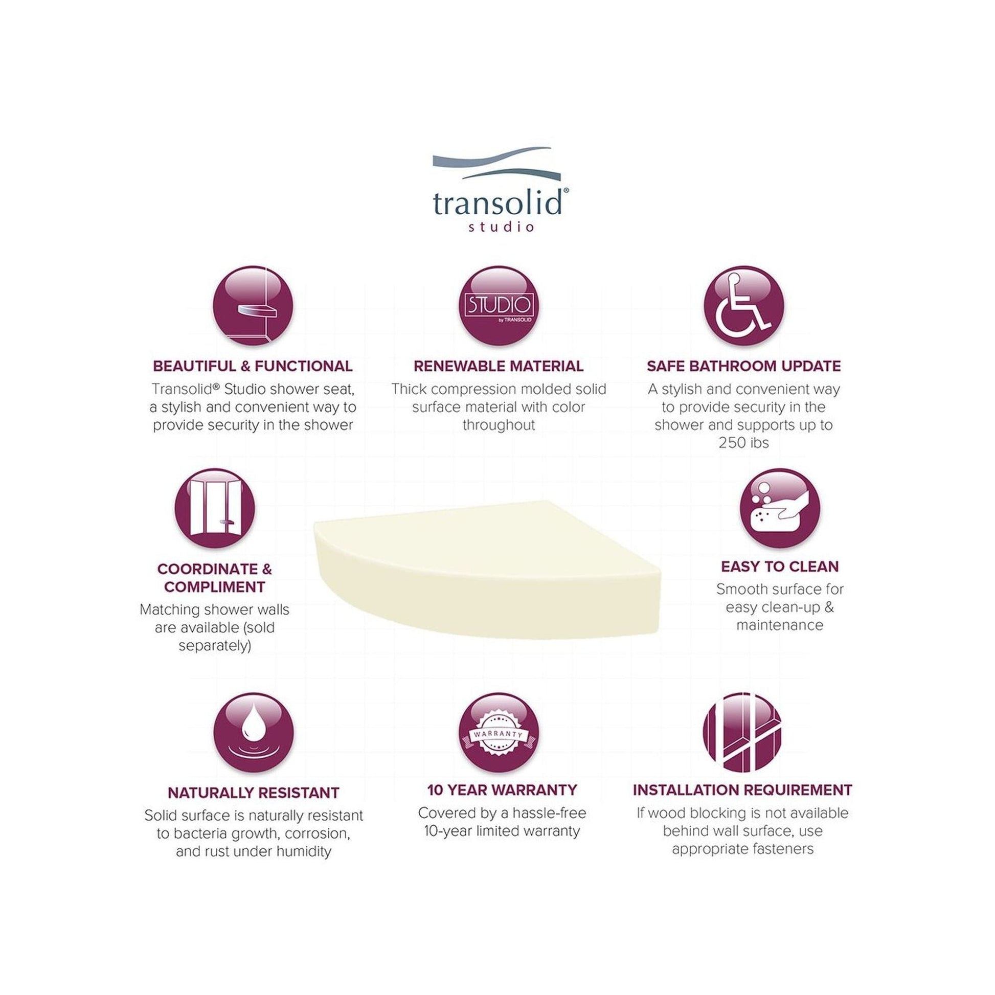 Sedile angolare per doccia Transolid Studio da 14 pollici x 14 pollici in superficie solida, montaggio a parete - 14,5 x 14,25 x 3