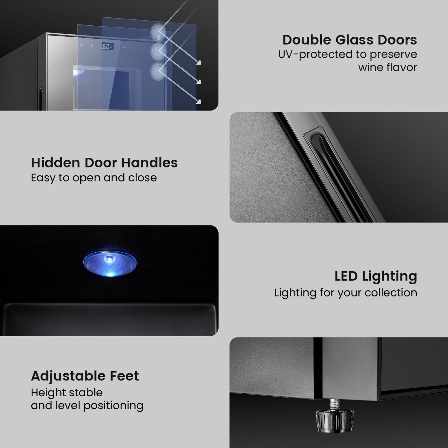 - Funzionamento silenzioso: funziona con vibrazioni e livelli di rumore minimi, garantendo un ambiente tranquillo in cui i tuoi vini possono invecchiare con eleganza.