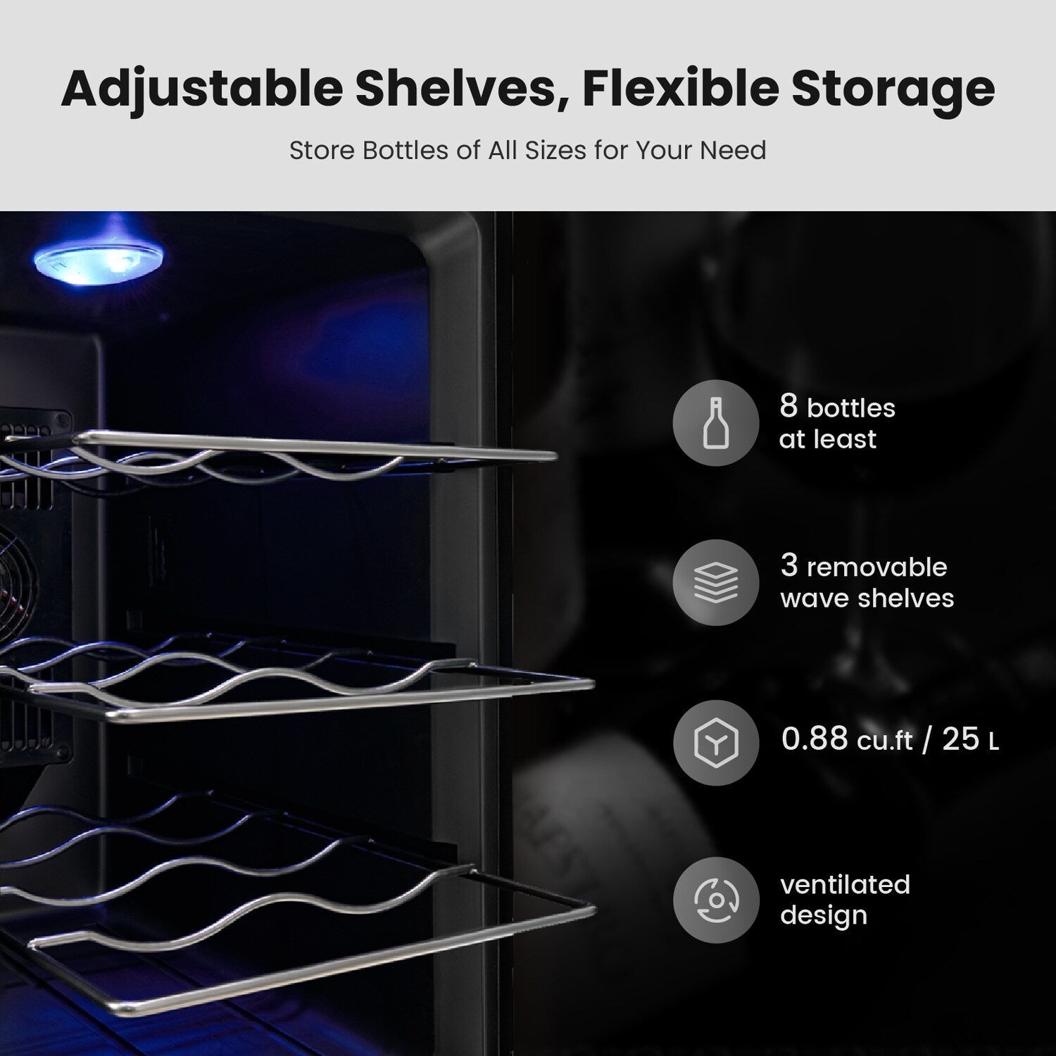 - Versatile: può contenere 8 bottiglie standard di Bordeaux da 750 ml con tre ripiani rimovibili per il vino, consentendo flessibilità per bottiglie di diverse dimensioni e tipologie.